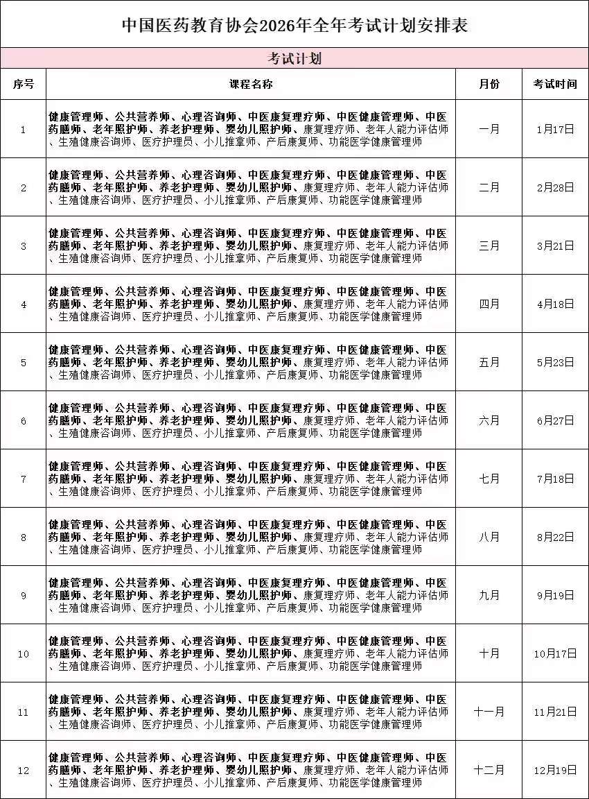 中国医药教育协会:健康管理师、公共营养师、心理咨询师、中医康复理疗师、中医健康管理师、中医药膳师、老年照护师、养老护理师、婴幼儿照护师、康复理疗师、老年人能力评估师、生殖健康咨询师、医疗护理员、小儿推拿师、产后康复师等岗位能力证书项目报考说明