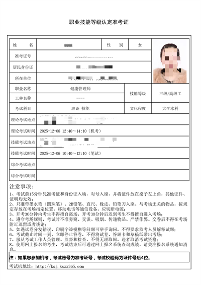 【准考证领取】2025年12月6日批次职业技能等级考试:健康管理师、企业人力资源管理师、保育师、养老护理员、汽车维修工、营养师(公共营养师)、婴幼儿发展引导员(育婴员)、评茶师等准考证领取通知
