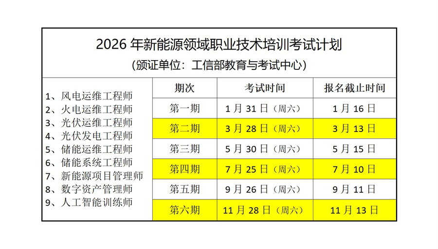 【考试安排】2025年1月工业和信息化部教育与考试中心:新能源领域(风电运维工程师、光伏运维工程师、光伏发电工程师、火电运维工程师、储能运维工程师、储能系统工程师、新能源项目管理师等)专项技术人才培训项目报考安排通知