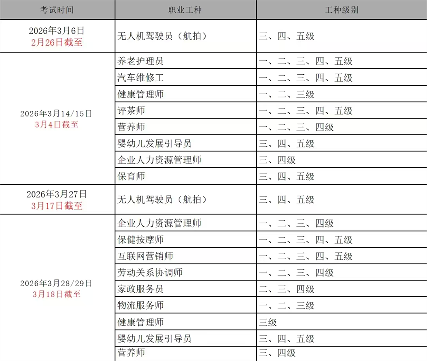【考试安排】2026年3月批次职业技能等级认定考试:婴幼儿发展引员(育婴员)、企业人力资源管理师、评茶师、电工、保育师、健康管理师、汽车维修工、养老护理员、营养师、无人机驾驶员(航拍)、养老护理员、物流服务师、保健按摩师、互联网营销师、劳动关系协调师、家政服务员等职业技能等级认定考试通知