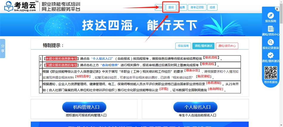 一、进入“职业技能考评平台”首页 (点此进入),点击首页右上方【查询】,输入个人报名相关信息查询考试报名记录;